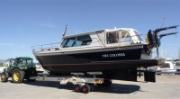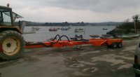The Hydrotrans hydraulic slipway trailer is designed to launch and recover boats on a slipway, transport the boats over land and park them in a storage area. The Hydrotrans SW20 can be pulled by a reach truck or a agricultural tractor. It uses the hydraulic facility of the pulling device for all the hydraulic functions. The boat is lifted by 4 hydraulic pads with soft pads on them to avoid damaging the hull. The front of the boat is supported by the crossbeam with also a soft pad on it to avoid damage. For sailboats a adaptor is available. The width of the trailer frame and the height are hydraulic adjustable. The pads and drawbar are manually or hydraulic adjustable.